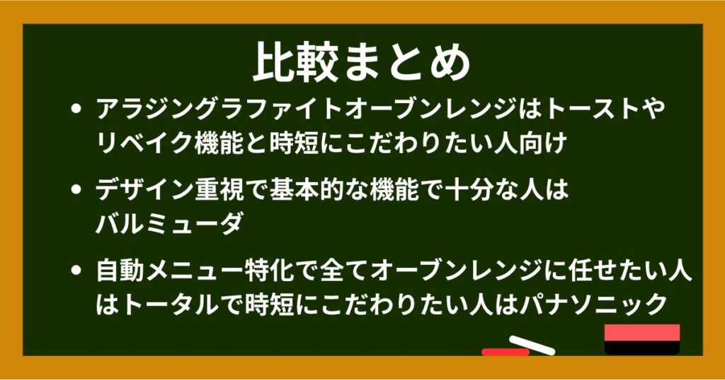 アラジンのグラファイトオーブンレンジは「トースト特化+オーブンレンジ化した万能機」、バルミューダは「デザインと操作性重視のシンプル高級レンジ」、パナソニックは「自動調理・センサー・スチーム重視の多機能機」という棲み分けです。